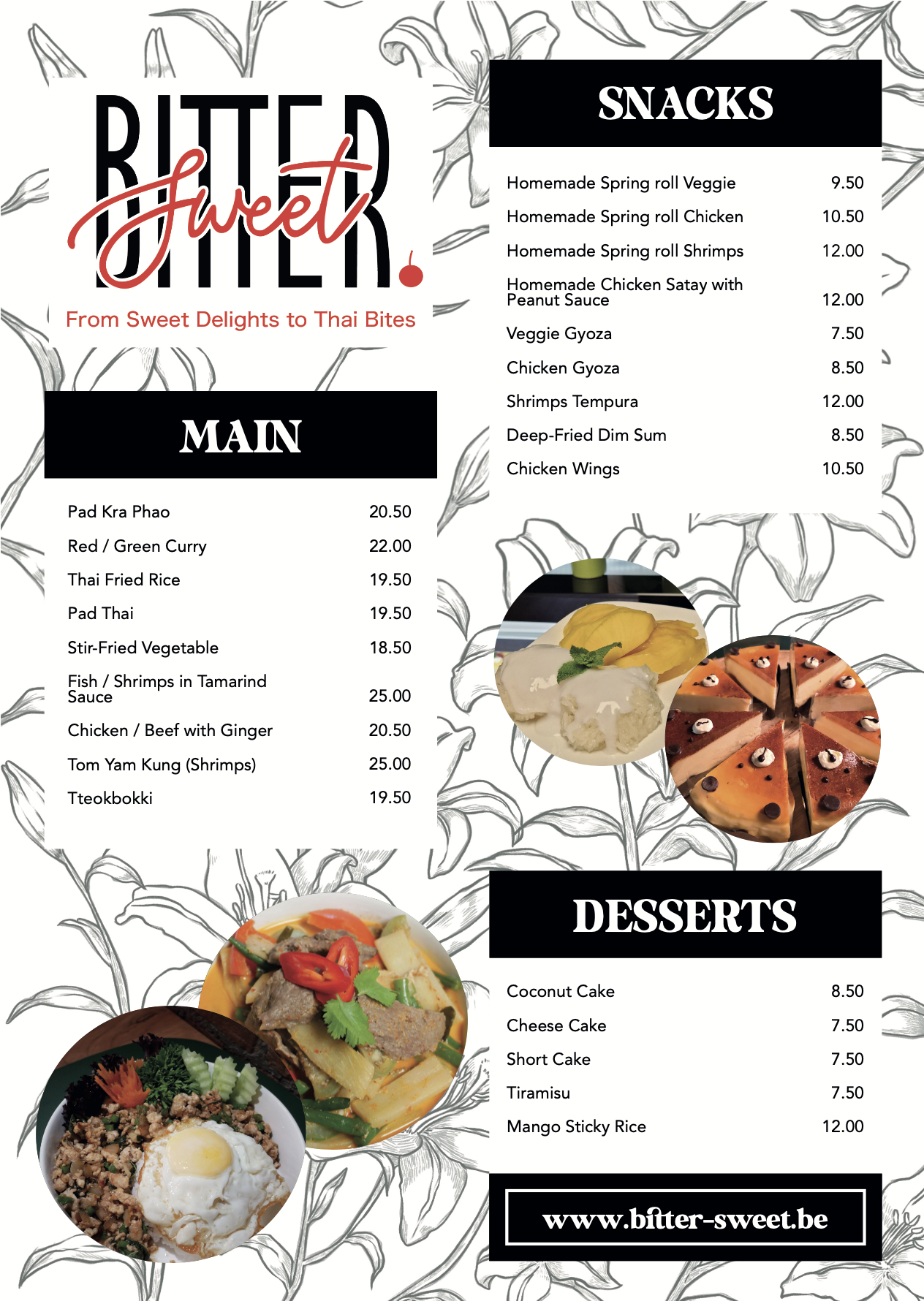 We zijn geen klassieke lunchbar en ook geen traditioneel Thais restaurant. Bitter Sweet is een plek waar je overdag binnenwandelt voor een goede kop koffie met een stukje huisgemaakte taart, en waar je ‘s avonds gezellig kan tafelen met authentieke Thaise gerechten die met liefde zijn bereid.