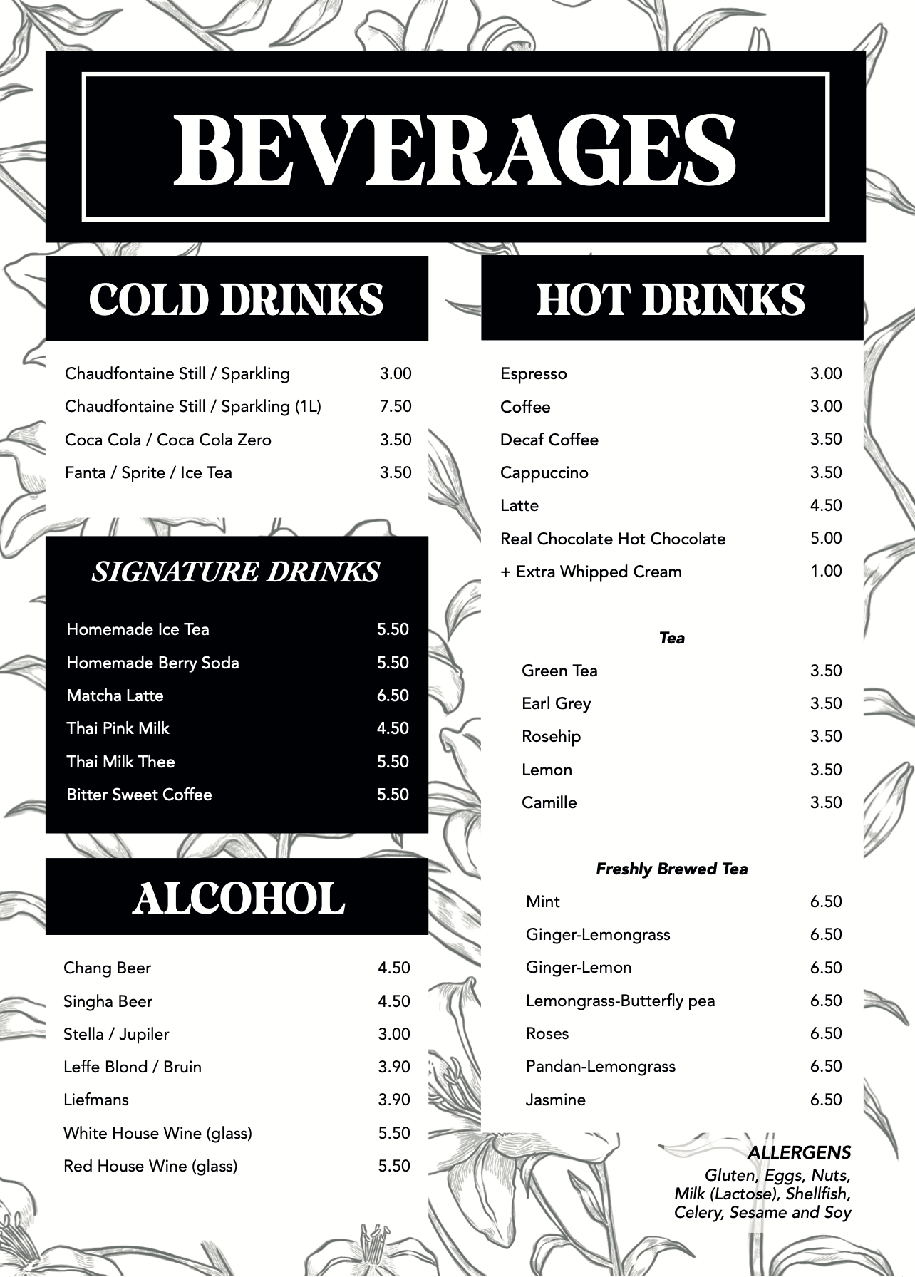Onze kaart brengt twee werelden samen: kruidige Thaise klassiekers en verfijnde desserts zoals luchtige taarten, romige tiramisu en andere zoete verleidingen. Alles wordt met zorg gemaakt, in onze eigen keuken, met verse ingrediënten en een persoonlijke toets.